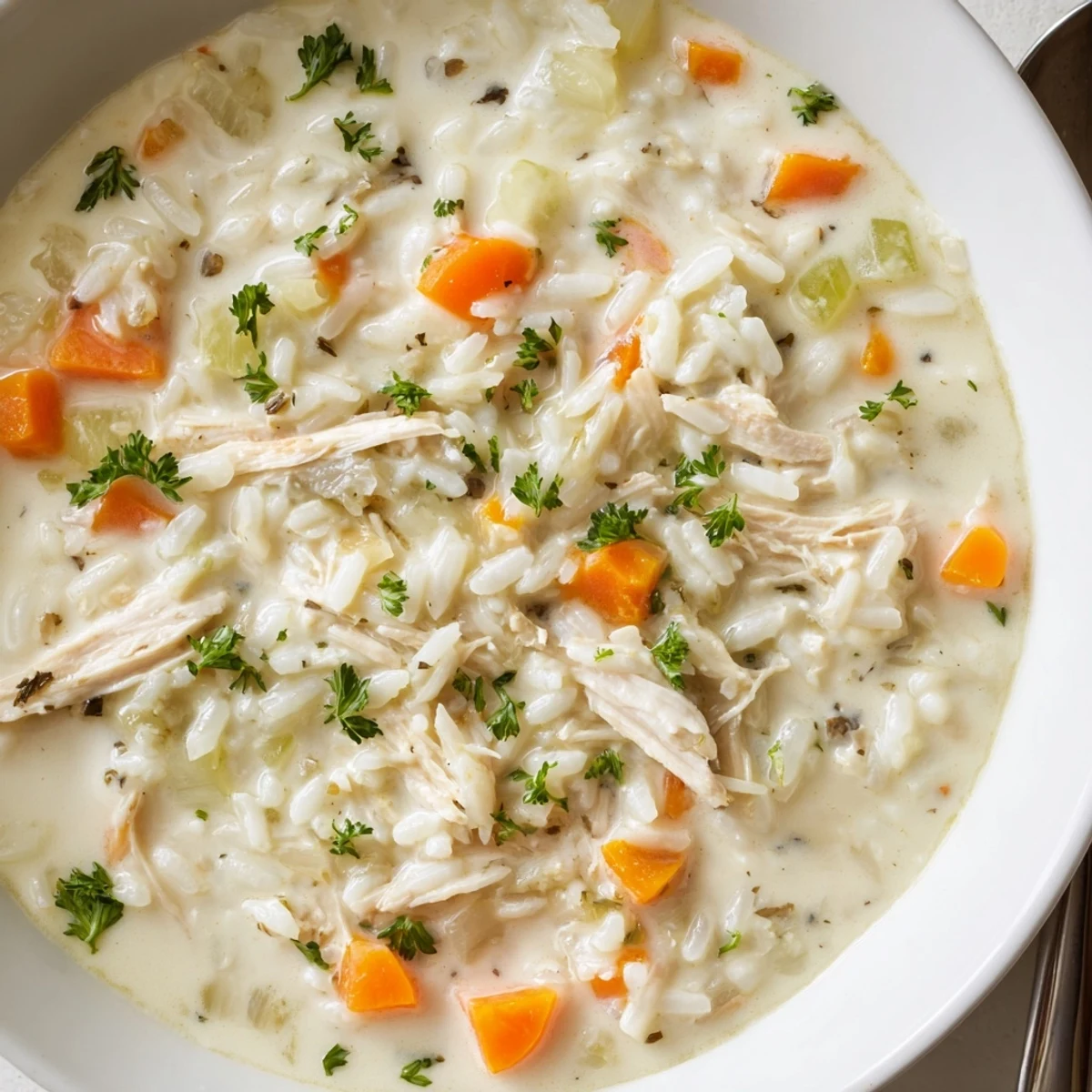 This velvety chicken and rice soup begins with butter-sautéed onion, carrot and celery, then a quick flour roux to add body. Stir in chicken broth and long-grain rice, simmer until nearly tender, then add shredded chicken, milk and cream and finish gently until silky. Remove the bay leaf, season, and garnish with parsley. For gluten-free, use a cornstarch slurry.