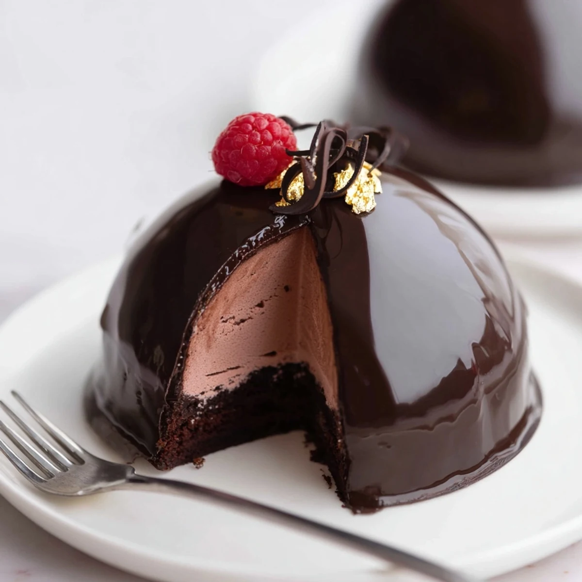Make thin chocolate shells by coating silicone dome molds with melted dark chocolate and chilling until set. Whip cold cream and fold into mascarpone sweetened with powdered sugar, then stabilize with dissolved gelatin. Pipe the mousse into the shells, chill until firm, unmold, and pour a warm cocoa mirror glaze over the chilled domes. Finish with gold leaf, curls, or berries and keep refrigerated until serving.