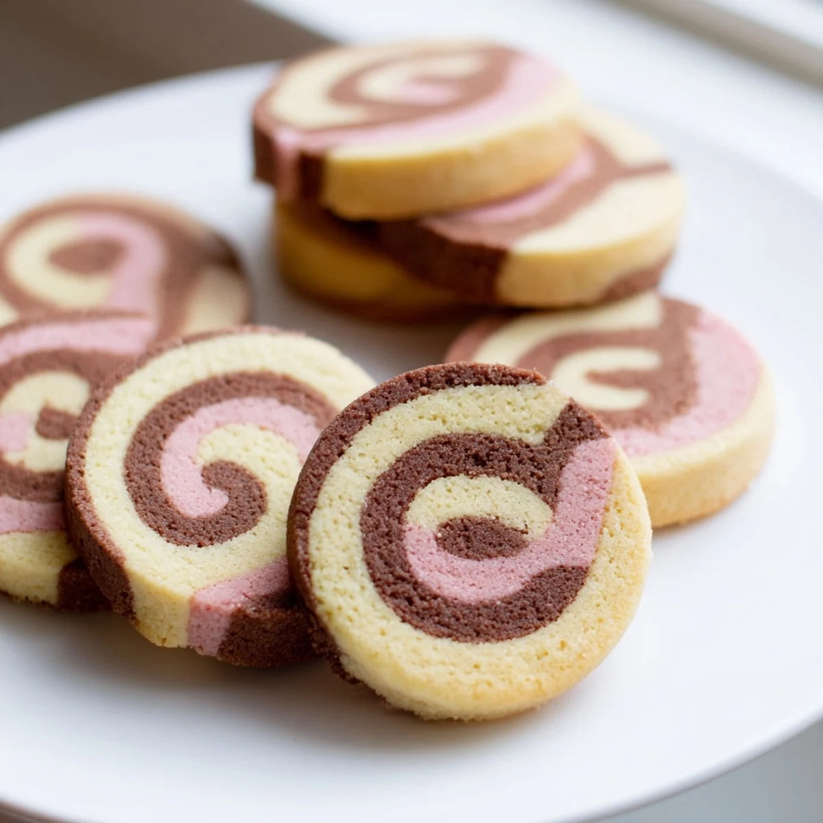 Chill each dough layer thoroughly before stacking. When rolling the log, start from the long edge and roll tightly but gently. Keep the finished log very firm in the refrigerator before slicing—this ensures clean, defined spirals that don't blur together.
