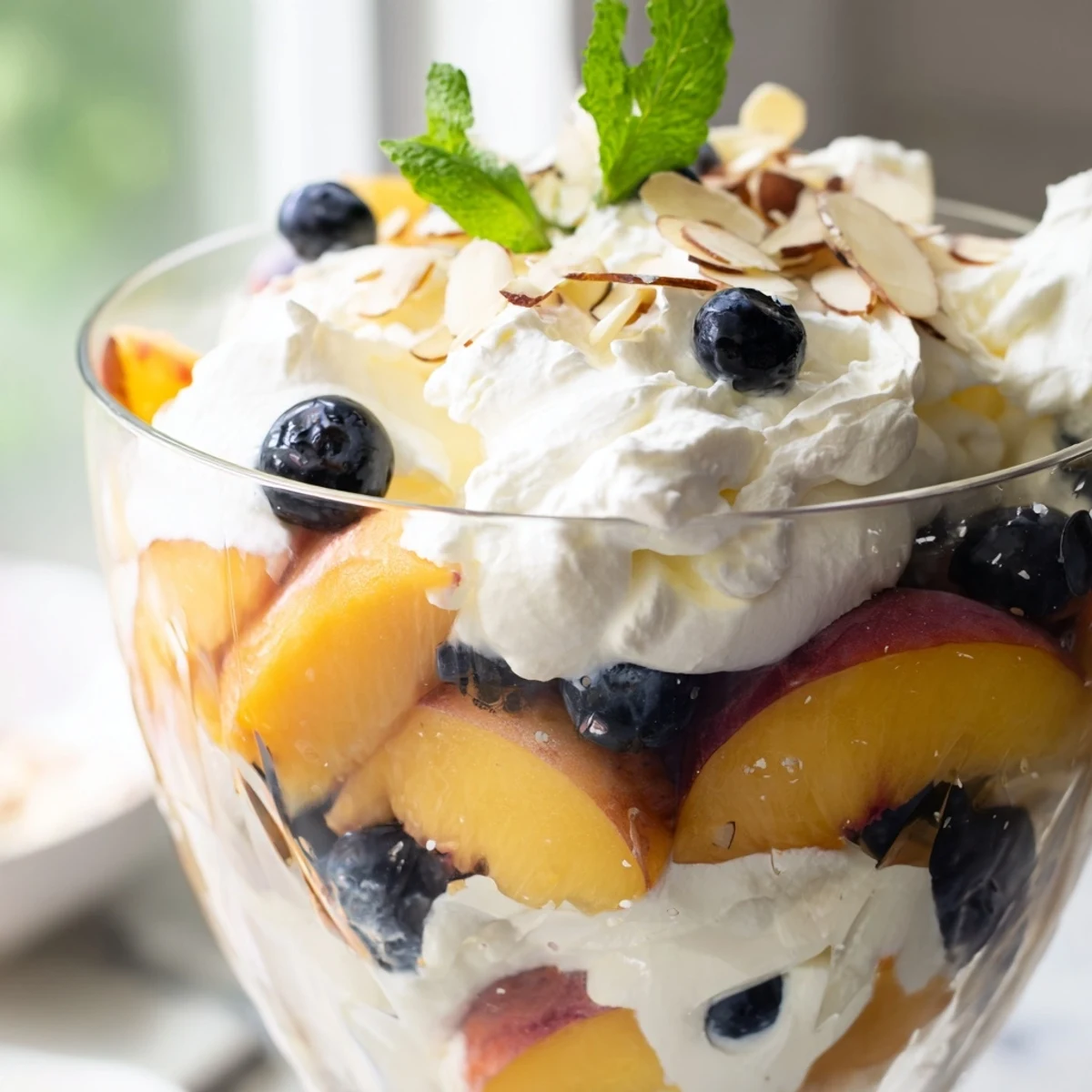 Indulge in this refreshing summer dessert combining ripe, juicy peaches with freshly whipped vanilla cream. The chilled fruit provides natural sweetness while the light, airy whipped cream adds luxurious texture. Fresh mint leaves brighten each bite, making this an ideal finish to any summer gathering.