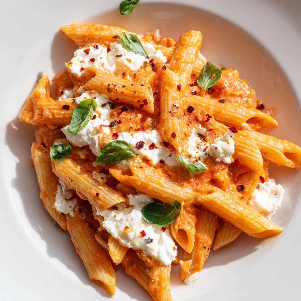 This vibrant Italian-inspired pasta combines tender penne with a rich garlicky tomato sauce. The dish comes together in just 30 minutes, making it perfect for busy weeknights. Fresh ricotta adds creamy richness throughout, while torn basil leaves provide bright aromatic notes. The sauce balances sweetness from tomatoes with gentle heat from optional red pepper flakes.